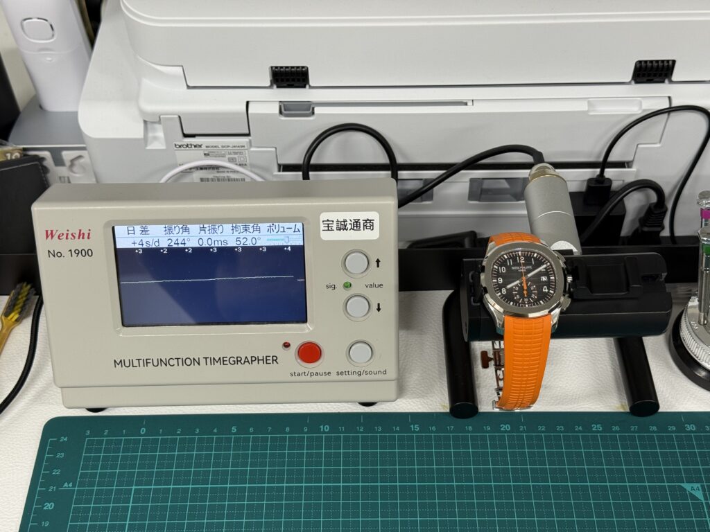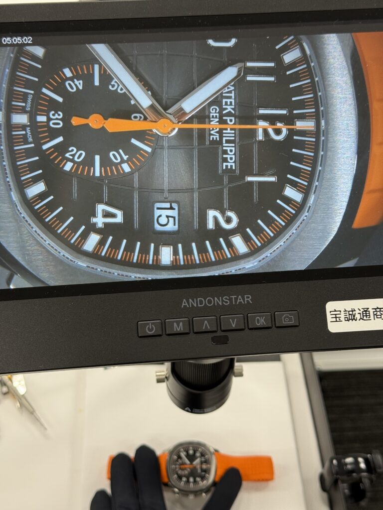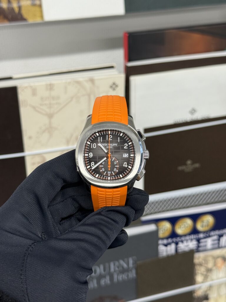 ブラックグラデーションの文字盤に映える、オレンジのクロノグラフ秒針と積算計。この「差し色」が、アクアノートにこれまでにない躍動感と若々しさを与えています。